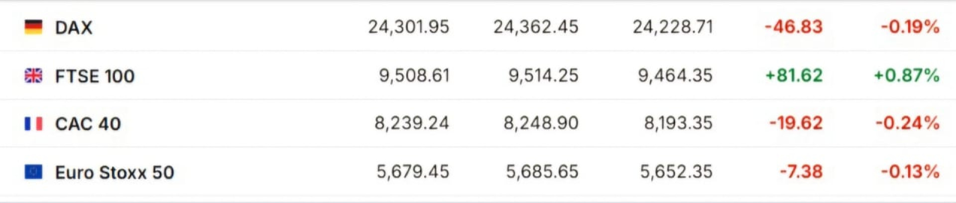 Европейские рынки показали разнонаправленную динамику из-за разных факторов: большинство индексов, таких как DAX и CAC 40, снизились под давлением слабых корпоративных отчётов и возросшей геополитической неопределённости, а FTSE 100 вырос благодаря более мягким, чем ожидалось, данным по инфляции в Великобритании, которые снизили риск незапланированного повышения ставок.