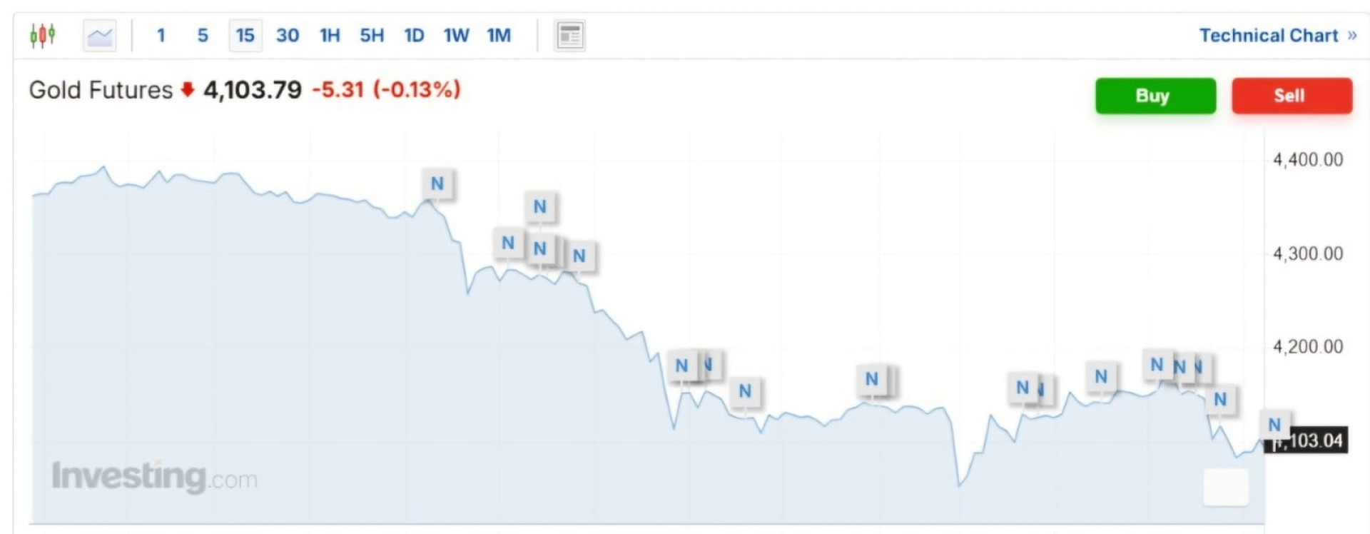 Фьючерс на золото понизился на 0,13 процента - до 4 103,79 доллара за унцию.