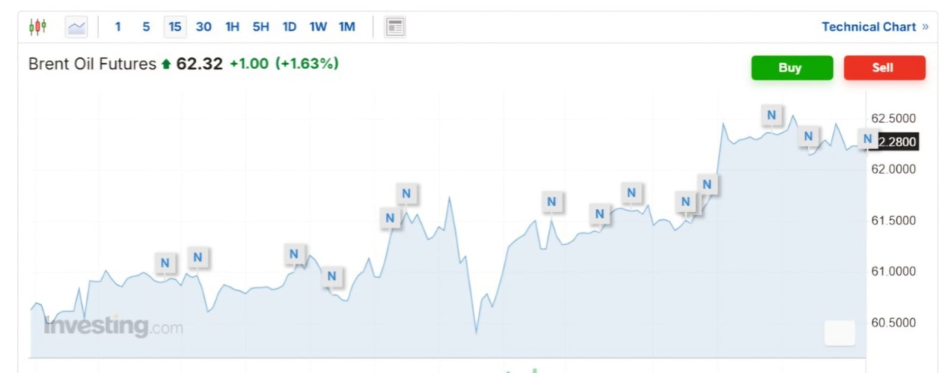 Цена декабрьских фьючерсов на нефть марки Brent повысилась на 1,63 процента - до 62,32 доллара за баррель.