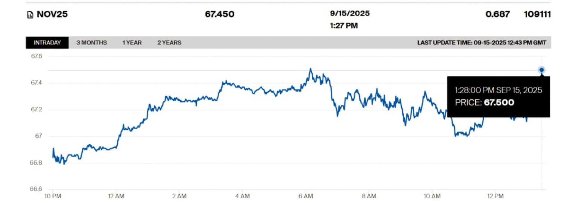 Цена ноябрьских фьючерсов на нефть марки Brent на лондонской бирже ICE повысилась на 0,69 процента - до 67,45 доллара за баррель.