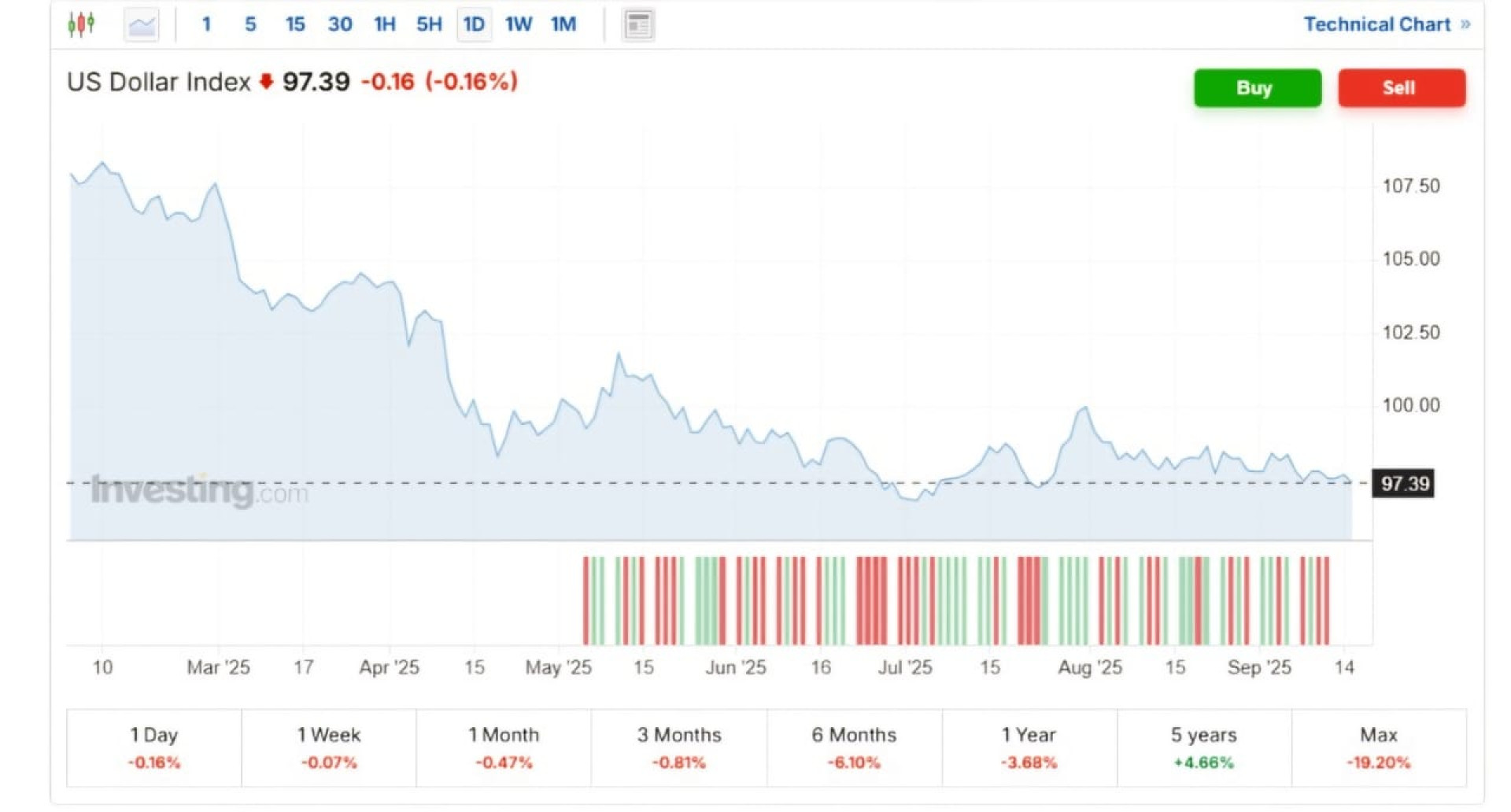 U.S. Dollar Index (DXY, курс доллара США по отношению к корзине основных мировых валют: евро, иена, фунт, канадский доллар, шведская крона, швейцарский франк) ослаб на 0,16 процента на фоне усиления ожиданий, что ФРС США скоро снизит процентную ставку, также слабые данные по рынку труда усиливают это представление, заставляя инвесторов переводить средства в другие валюты.