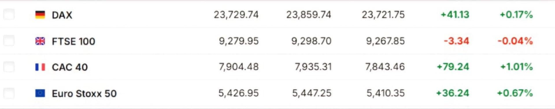 Из основных индексов DAX (+0,17 процента, Германия), CAC 40 (+1,01 процента, Франция), Euro Stoxx 50 (+0,67 процента, включает 50 крупнейших и наиболее ликвидных компаний стран еврозоны) оказались в плюсе. При этом FTSE 100 немного снизился (-0,04 процента, Великобритания).