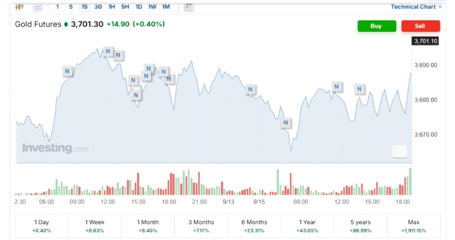 Фьючерс на золото повысился на 0,40 процента - до 3 701,30 доллара за унцию