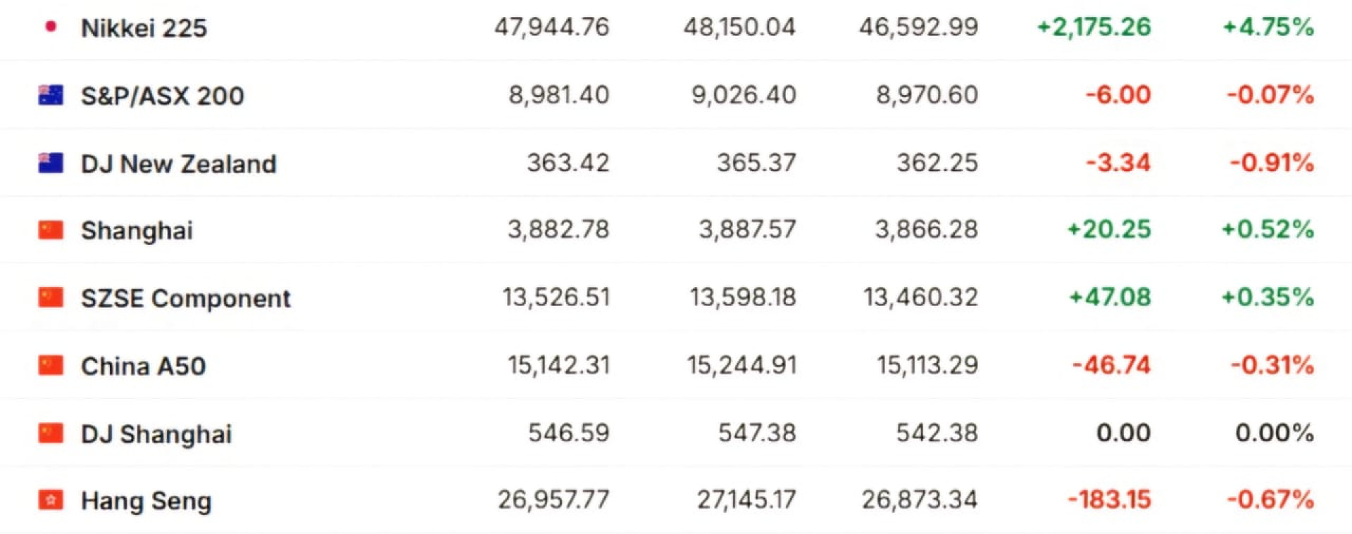 При этом в Японии индекс Nikkei 225 повысился на 4,75 процента, достигнув рекорда на фоне назначения Санаэ Такаити главой правящей партии, что привлекло инвесторов.