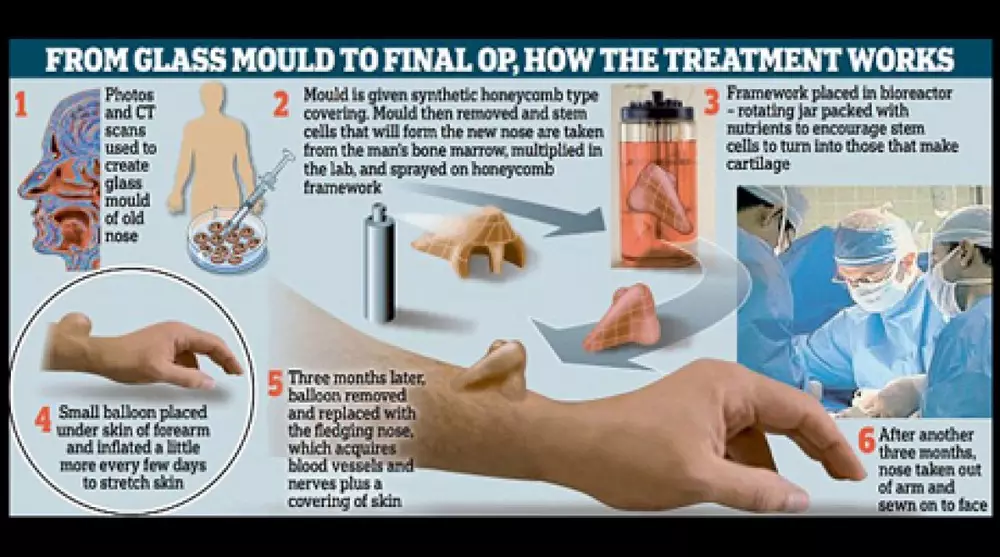 В начале врачи просканировали лицо мужчины и получили все данные по пропорциям его лица. Затем, согласно уникальной методике, из стволовых клеток пациента в пробирке выращивается основа нового органа. Под кожу на руке помещают небольшой шарик, объем которого постепенно увеличивают и тем самым растягивают кожу на руке. Через три месяца шарик убирают и на его место помещают выращенную хрящевую основу носа. В течение следующих трех месяцев в растущем на руке носе формируются нервы и крошечные кровеносные сосуды. После нос удаляют с руки и пришивают на лицо.