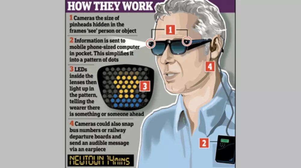 Очки оснащены миниатюрными камерами, светодиодами и карманным компьютером. Камеры фиксируют изображение, а затем передают информацию компьютеру. Миниатюрное устройство обрабатывает данные, после чего посылает сигналы владельцу очков в виде световых вспышек. С помощью этих сигналов незрячий человек может узнать, какой объект находится перед ним.