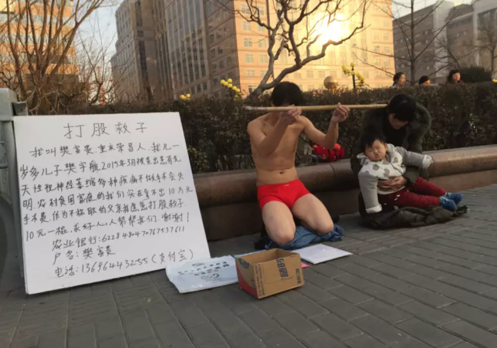 Житель Пекина Фан Фуджи встал на колени и предложил прохожим ударить его палкой всего за 10 юаней (1,5 доллара). Таким способом он хотел собрать необходимую сумму для операции его годовалого ребенка.