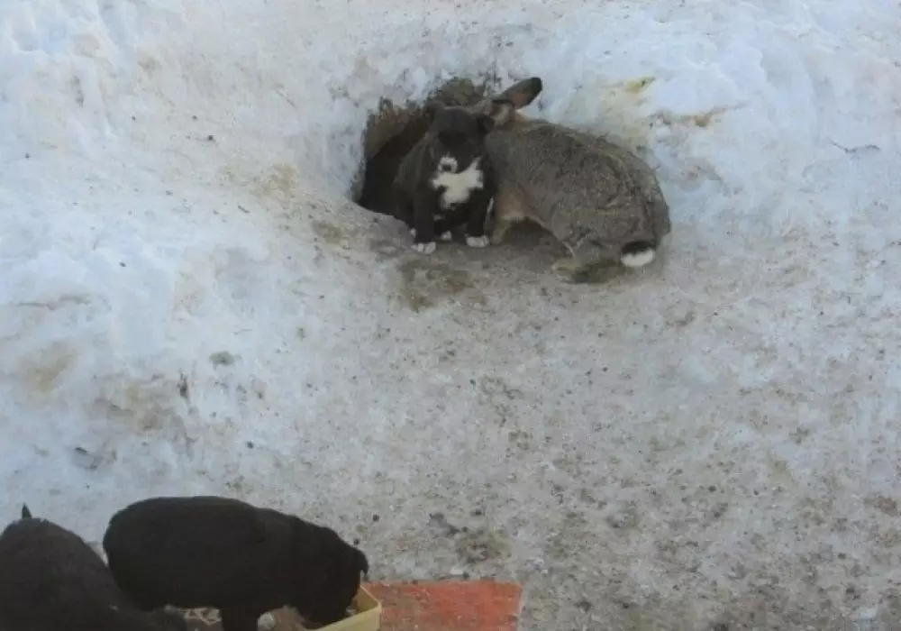 В норке они жили около полутора месяцев, в 40-градусные морозы он согревал малышей своим теплом. Необычную семейку заметила жительница Азово, которая стала их подкармливать. Вскоре приехали волонтеры. Щенки выбежали из норки, кролик же засуетился, испугавшись чужаков, он попытался их загнать обратно.