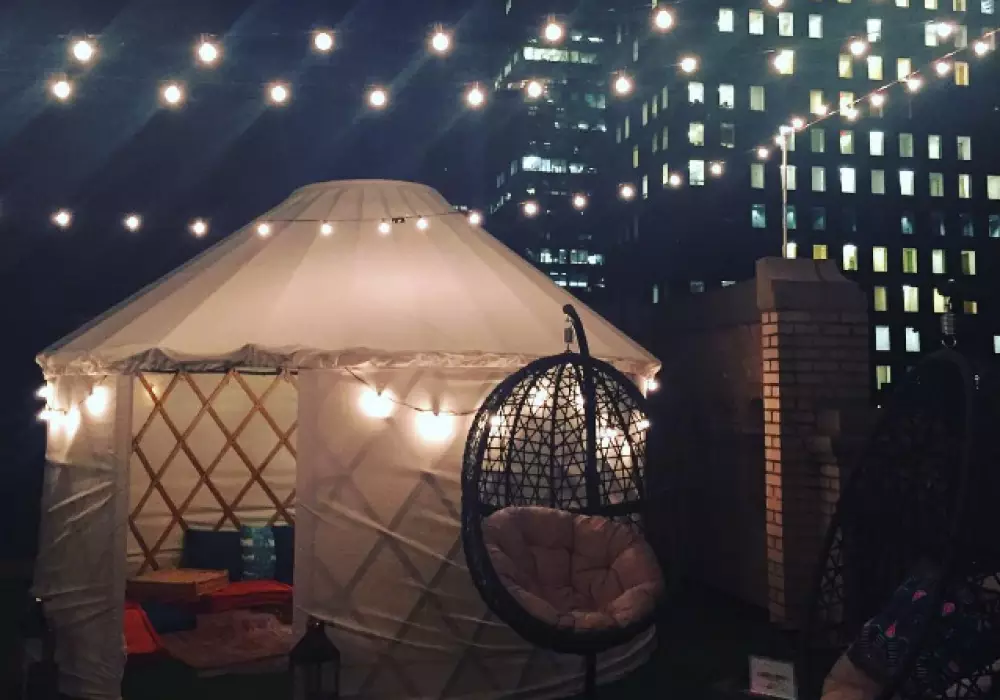 Юрта расположена на террасе в оживленной части города, но, по словам дизайнера Кимберли Винтроп, уникальная конструкция имеет хорошую звукоизоляцию и звуки проезжающих машин не помешают гостям выспаться.