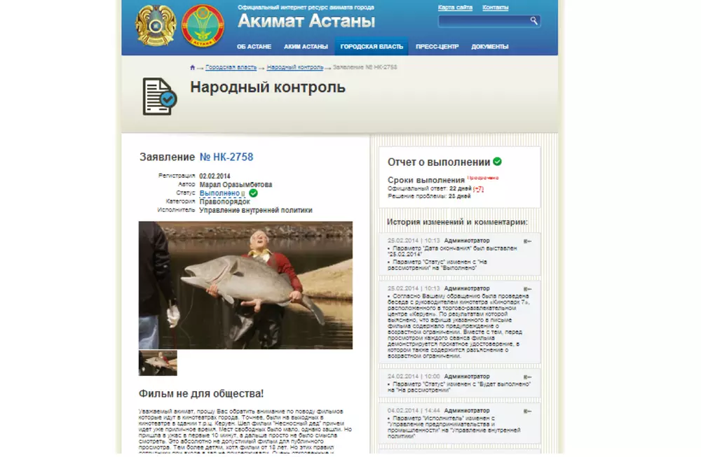 На официальном сайте акимата Астаны уже продолжительное время красуется странная картинка: мужчина держит в руках гигантскую рыбу. Странность картинки в том, что у этой рыбы человеческие гениталии, передает Tengrinews.kz. Это изображение служит иллюстрацией к письму жительницы Астаны. Таким образом неравнодушная горожанка попыталась обратить внимание чиновников на то, какие фильмы показывают в кинотеатрах. "Были на выходных в кинотеатре в здании ТРЦ "Керуен". Шел фильм "Несносный дед", причем идет уже приличное время. Мест свободных было мало, однако зашли. Но пришла в ужас в первые 10 минут, а дальше просто не было смысла смотреть. Это абсолютно недопустимый фильм для публичного просмотра. Тем более детям, хотя фильм от 18 лет. Но этих правил сотрудники при входе в зал не придерживались. Очень откровенные и пошлые сцены. Билет на фильм стоит 1400 тенге, это сколько денег они делают, отравляя психику людей? Куда смотрят администрация кинотеатра? Где выше сидящие чиновники, которые твердят о воспитании нашего казахского народа, когда вокруг творится такая грязь. Обратите внимание!" - пишет женщина. В свою очередь, на это обращение ответило Управление внутренней политики акимата города, которое сообщило, что они провели беседу с руководством кинотеатра "(...) Выяснено, что афиша указанного в письме фильма содержала предупреждение о возрастном ограничении. Вместе с тем, перед просмотром каждого сеанса фильма демонстрируется прокатное удостоверение, в котором также содержится разъяснение о возрастном ограничении", - кратко сообщили в акимате.