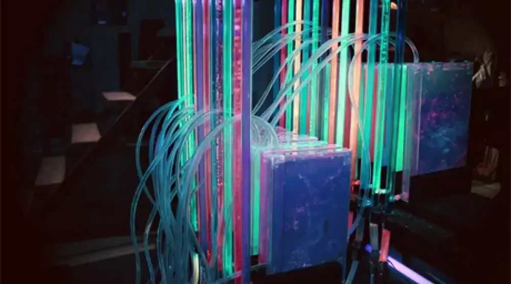 "Пылесосный" орган очень скромных размеров. В его трубы насыпана разноцветная флуоресцентная пыль. А сам орган приводится в действие с помощью пылесоса, который подсоединен к инструменту. В результате получается очень красочное зрелище.