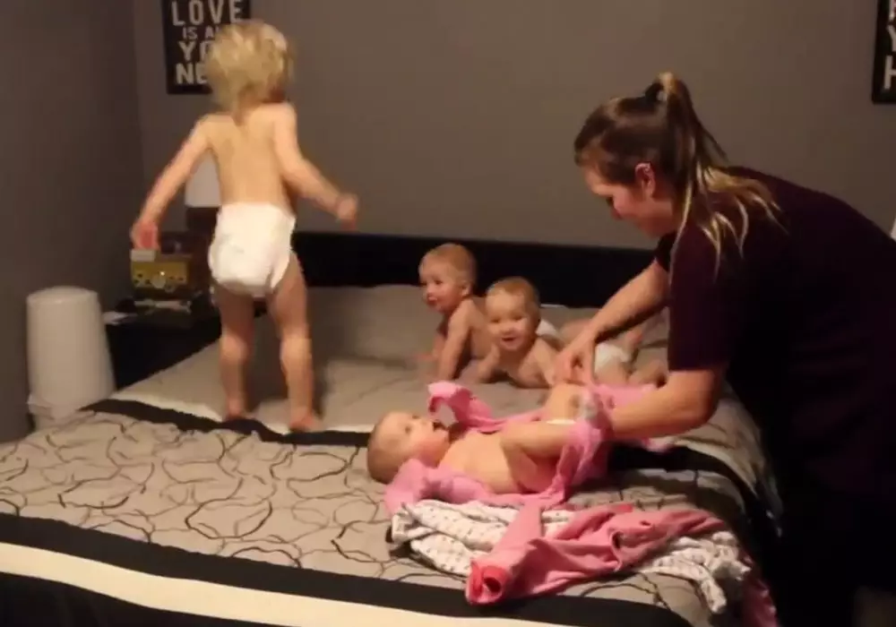 На видео заметно, что процесс переодевания малышей требует немалых физических усилий и выдержки. Но вместе с тем, героиню ролика эти заботы никак не пугают, и она с улыбкой на лице с ними справляется.