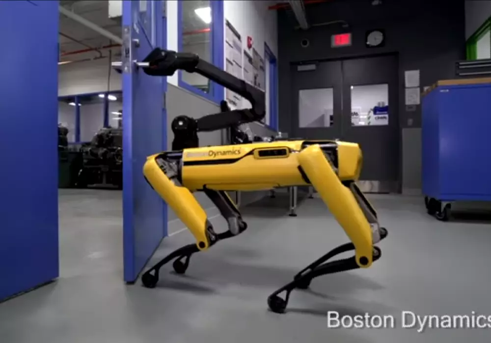 На видео "безрукая" робособака призывает на помощь сородича с "рукой". Последний открывает ей дверь с помощью "лапы"-манипулятора, запускает ее в другое помещение, при этом придерживая дверь. В итоге обе робособаки "сбегают".