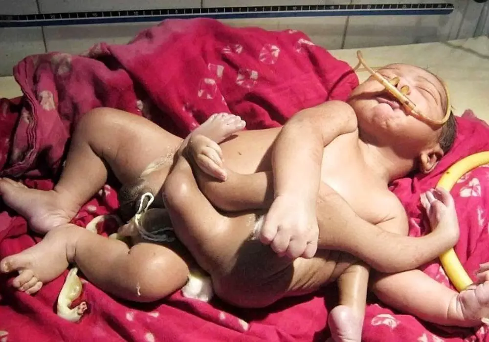 Мальчик с редкой врожденной аномалией появился на свет в городе Баруйпир (Baruipur) в индийском штате Западная Бенгалия. Ребенок родился с четырьмя руками и четырьмя ногами. Местные жители тут же окрестили мальчика "божественным" из-за его схожести с традиционными индийскими богами, которые изображаются с несколькими конечностями, пишет британская газета Daily Mail.
