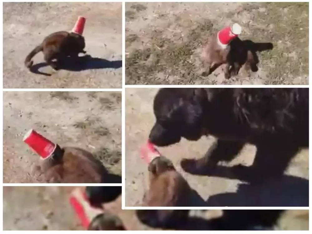 Неизвестно, каким образом кот засунул свою голову в пластиковый стаканчик. Кот пытался освободиться самостоятельно, однако все его старания были тщетны. Через несколько минут к коту подошел пес и аккуратно снял с его головы стаканчик.