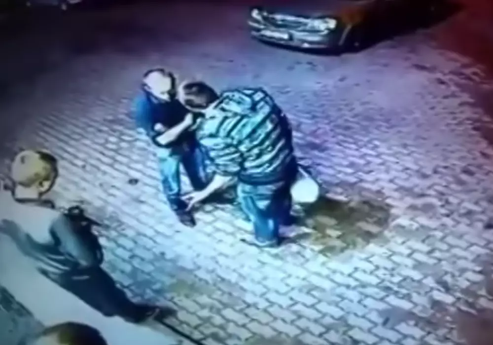 Двое мужчин решили разобраться с пожилым человеком на парковке. Они не ожидали, что из этого выйдет. Видеозапись с камеры наблюдения выложил в YouTube пользователь Илья Васильев. Судя по всему, дело происходит где-то на Украине. На спине у охранника видна надпись на украинском языке "Охорона" (охрана).