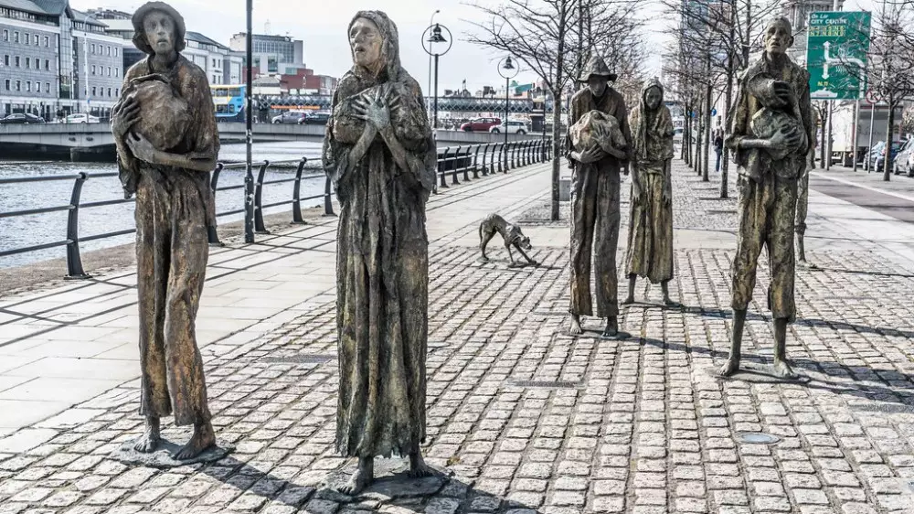 Это самая страшная и реалистичная скульптурная группа в Дублине, Ирландия, - изможденные, истощенные люди. Посвящена жертвам массового голода 1845-1849 годов. В середине XIX века ирландцы стали массово покидать родные места. Их целью были более благополучные на тот момент государства - США, Британия. Причиной такого исхода стал массовый голод в результате аграрного кризиса, политики английских властей. В результате погибло около четверти населения.