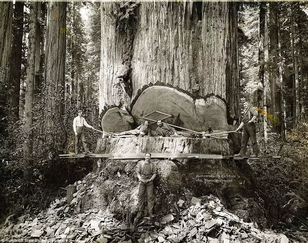 Университет имени Гумбольдта в штате Калифорния представил редкие фотографии, на которых запечатлена работа лесорубов на северо-западе штата, где произрастают гигантские секвойи. Снимки сделаны в 1915 году шведским фотографом Эриксоном (A.W. Ericson). Как видно, в то время лесорубам приходилось валить деревья с помощью нехитрых инструментов, а сборка бревен осуществлялась тягловой силой.