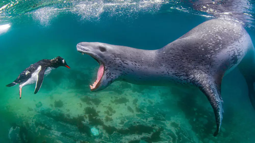 Амос Нахум стал победителем в номинации "Водная жизнь". С их шелковистой шерстью, большими темными глазами и вечными ухмылками леопардовые тюлени могут выглядеть совершенно безобидно. Однако у пингвинов другое мнение об этих мощных хищниках.