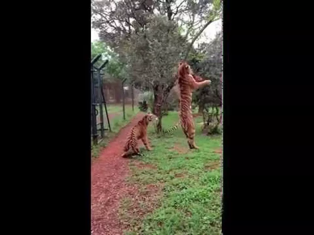На видео два тигра в одном из зоопарков в ЮАР на глазах у посетителей ждут, когда им бросят мясо. Один из них прыгает за ним на поразительную высоту. Этот момент автор видео перевел в режим slow-motion. Видео стало популярным за считанные минуты и уже собрало более 2,5 миллиона просмотров.