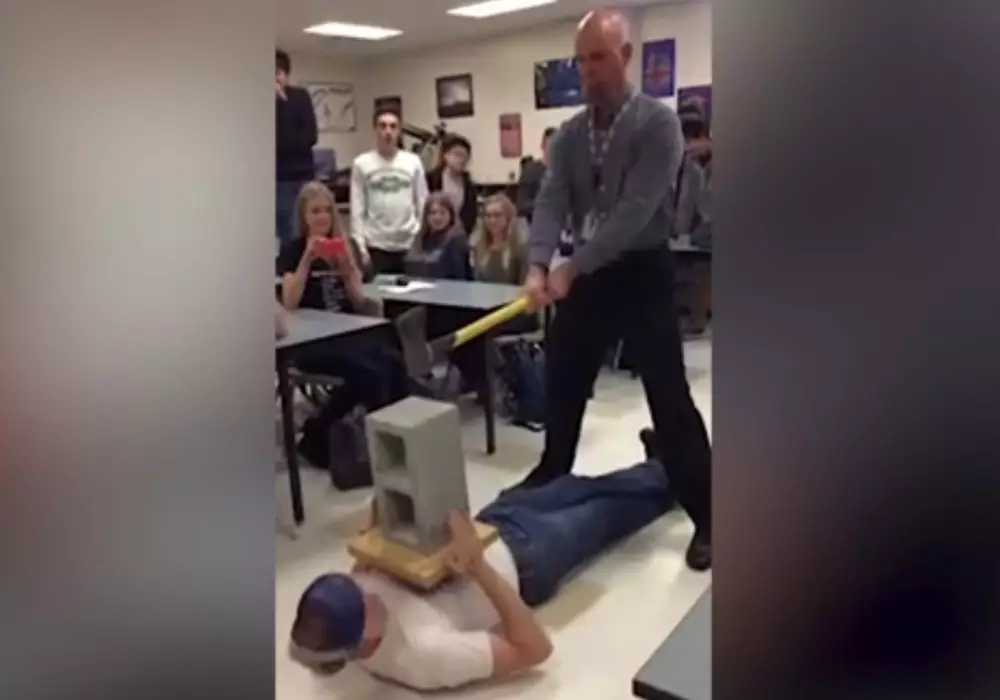В Интернете появилась видеозапись, на которой учитель физики получает удар между ног обухом от топора, сообщает The Telegraph. На видео мужчина лежит на земле, держа на груди цементный блок. Его ассистент наносит сильный удар обухом топора сверху вниз, но по блоку промахивается. В результате лежащий мужчина получает удар между ног.