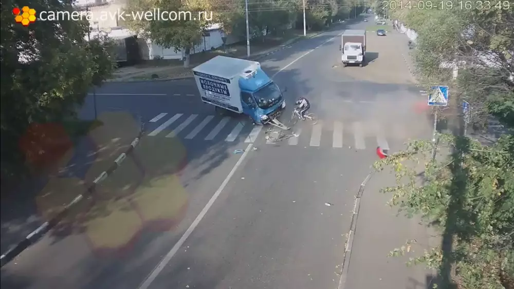 При этом от легкового автомобиля отлетает бампер, после чего она уезжает дальше и пропадает из кадра. В свою очередь, грузовик заваливается набок, а оказавшийся в самом центре этих жутких событий велосипедист не получает никаких повреждений. Как говорят в таких случаях, родился в рубашке.