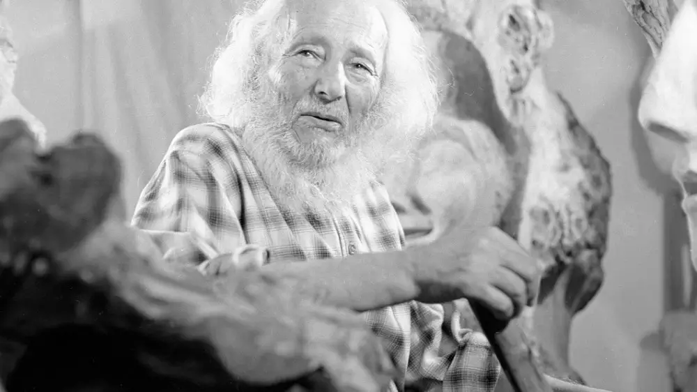 На экране коренастый, полутораметрового роста, 96-летний, с огромной седой бородой старичок, похожий на Саваофа или рождественского гнома, деловито расхаживал среди огромных деревянных и гипсовых скульптур, работал по ним резцом, и глаза его блестели живым, молодым озорством. А диктор рассказывал в это время, что Исаак Иткинд был в 30-е годы знаменит вровень с Шагалом, Эрьзей и Коненковым и что скульптуры Иткинда стоят в музеях Франции, Западной Германии, США и... в кладовых-запасниках Русского музея в Ленинграде и Пушкинского музея в Москве.