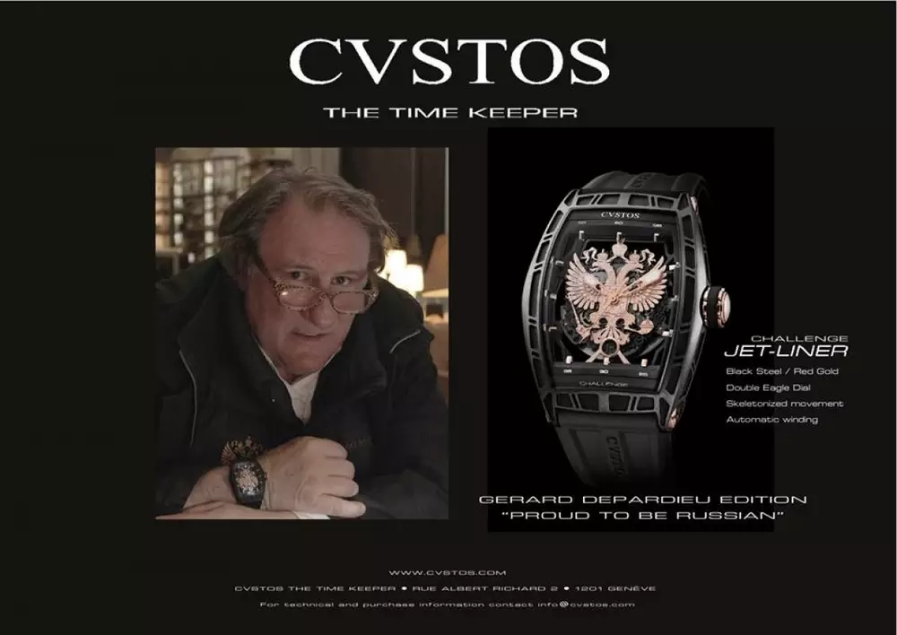 Актер Жерар Депардье выпустил серию патриотических часов "Горжусь быть русским!", сообщает "Московский комсомолец". Российский гражданин запустил эксклюзивный бренд совместно со швейцарской компанией Cvstos. Часы украшены двуглавым орлом из чистого золота.