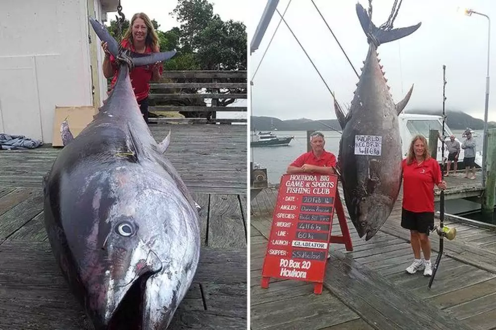 56-летняя любительница спортивной рыбалки из Новой Зеландии выловила самого большого тунца, пойманного когда-либо на спиннинг. Вес гиганта составил 411,6 килограмма, длина - 2,6 метра. Рекордный экземпляр попался на крючок в районе мыса Реинга на северо-западной оконечности Северного острова, сообщает The Fish Society