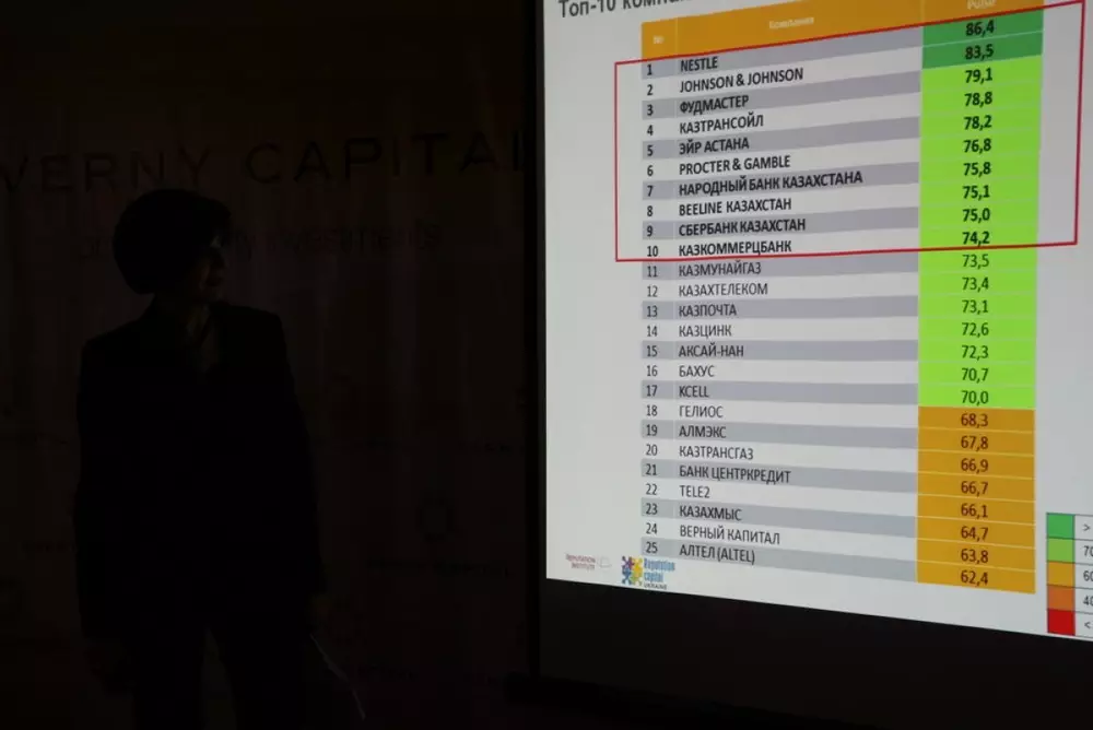 Так, в число десяти компаний с наилучшей репутацией вошли три мультинациональные компании (Nestle, Johnson&Johnson и Procter&Gamble), "Beeline Казахстан" и "Сбербанк Казахстан", которые нельзя назвать казахстанскими и отечественные "ФудМастер", "КазТрансОйл", "Эйр Астана", Народный Банк, Казкоммерцбанк.