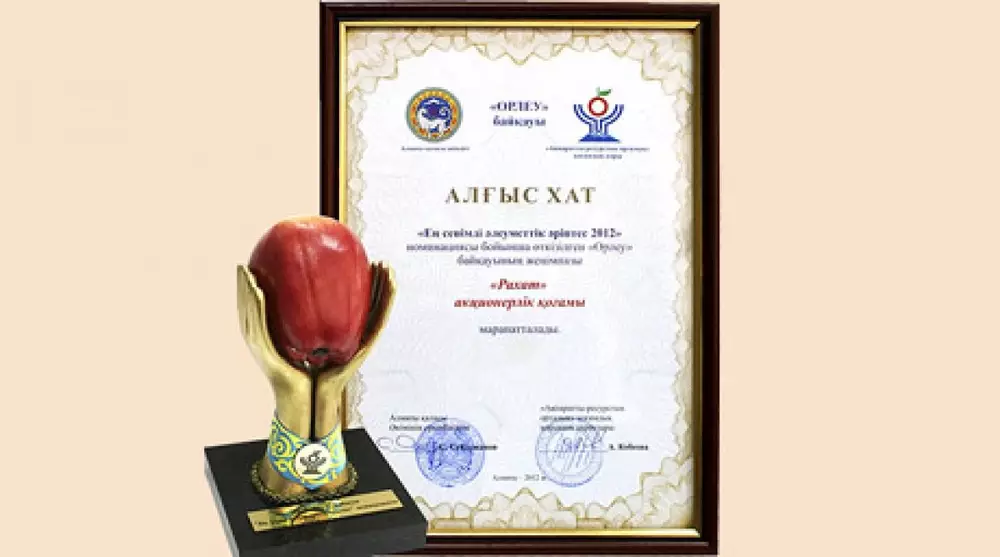 Акционерное общество "Рахат" признано победителем конкурса "Орлеу" в номинации "Лучший социальный партнер-2012", проведенного среди организаций НПО, бизнеса, СМИ и государственных структур, совместно с управлением внутренней политики города Алматы и ОФ "Информационно-ресурсный центр".
