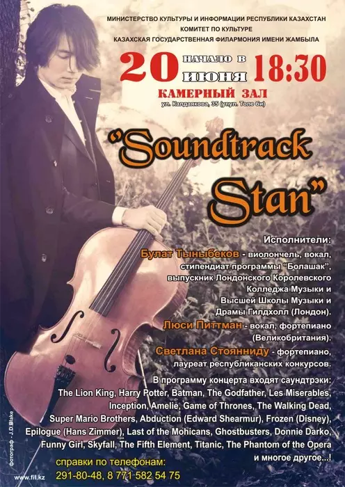 Солировать на концерте под названием SaundtrackStan будут выпускник королевского колледжа музыки и высшей школы музыки и драмы Гилдхолл - Булат Тыныбеков (виолончель), лауреат республиканских конкурсов Светлана Стояннида (фортепиано) и Люси Питтман из Великобритании (фортепиано, вокал).