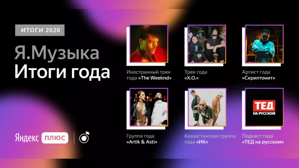 Лидером среди исполнителей в 2020 году стал казахстанский рэпер Скриптонит. Ему же принадлежит звание лучшего альбома за "2004". Самой прослушиваемой группой оказался поп-дуэт Artik & Asti, а среди казахстанских коллективов первое место занял проект "Ирина Кайратовна". При этом самым популярным треком на казахском языке стал "Әндетемін" (Мирас Жугунусов), а на казахском, смешанном с русским, - "Дискотека из 90" (RaiM, Artur, Zhenis).