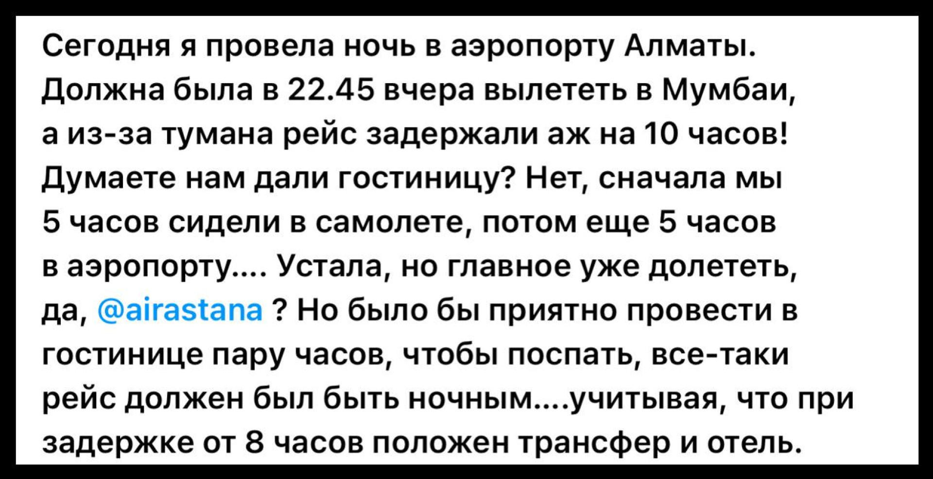 "Я должна была вылететь в Мумбаи в 22:45, но из-за тумана рейс задержали на целых 10 часов. Думаете, нам предоставили гостиницу? Нет. Сначала мы пять часов сидели в самолёте, потом ещё пять — в аэропорту. Устала, но главное — уже долететь", — рассказала казахстанка.