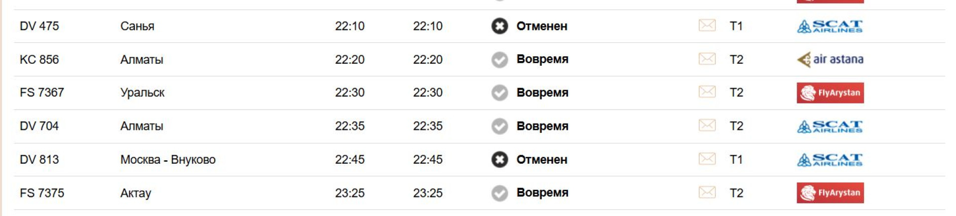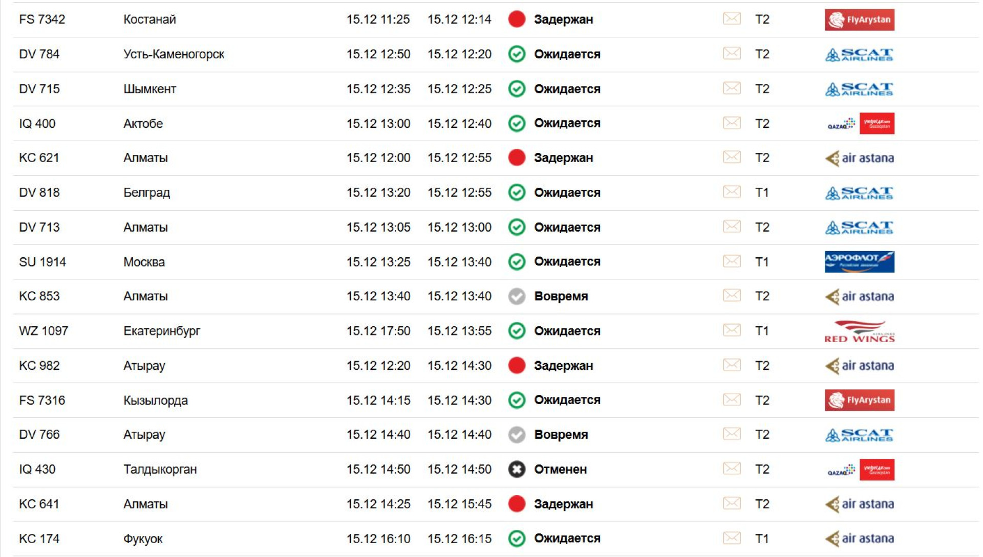 - FlyArystan, FS 7342 (Костанай) — задержка 49 минут;