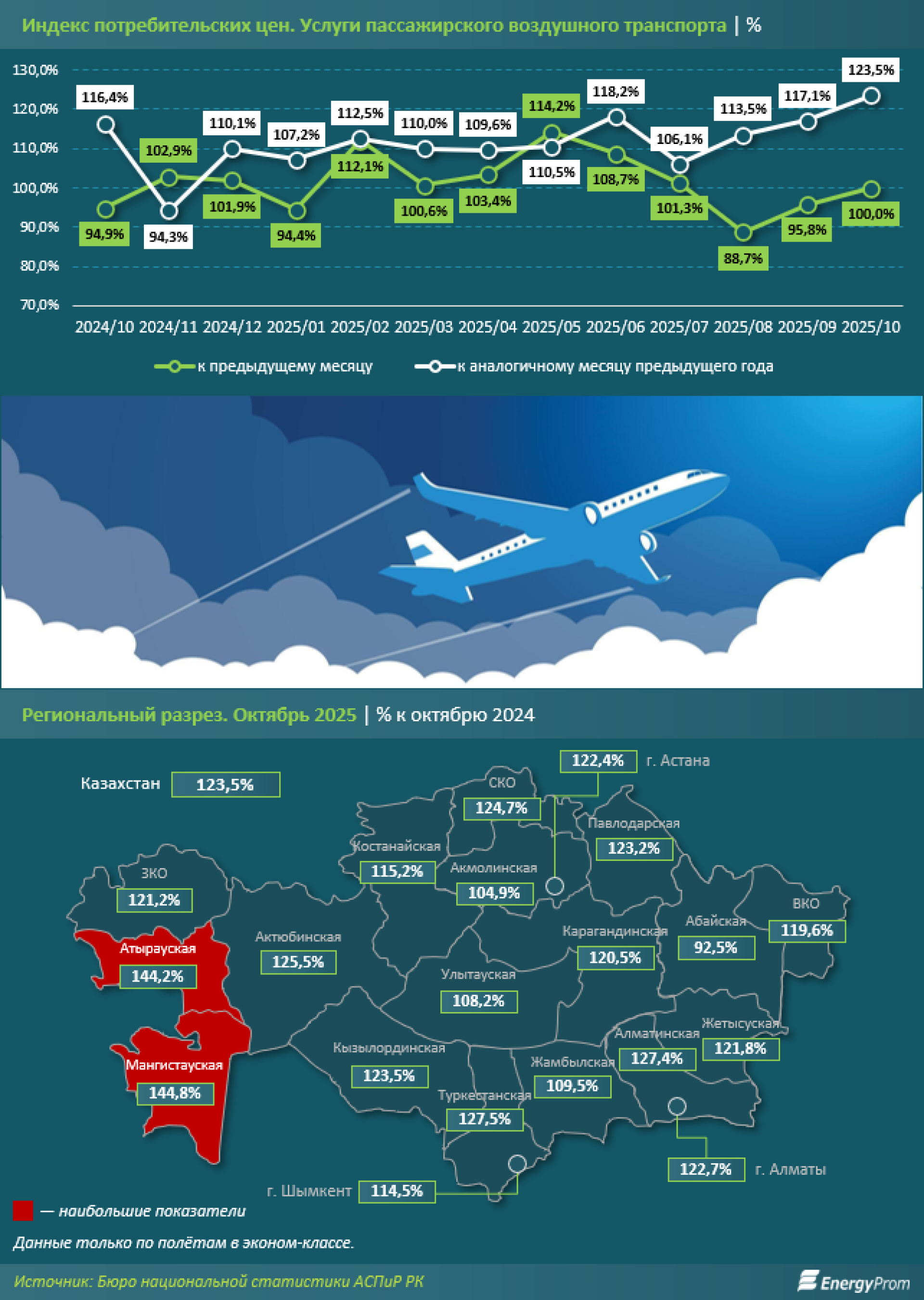 По данным информационно-аналитической системы "Талдау" Бюро национальной статистики, стоимость перелётов в экономклассе поднялась до индекса 123,5 процента. Такой же заметный скачок фиксировали два года назад, в ноябре 2023-го. В течение последнего года цены тоже менялись, но куда скромнее — индекс держался в диапазоне 107–117 процентов.