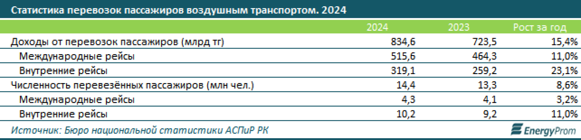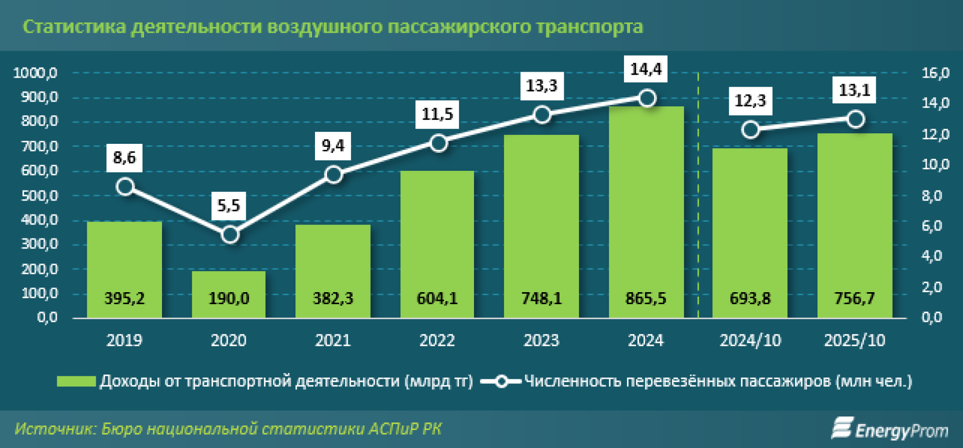 За десять месяцев, как отмечает агентство, услугами авиаперевозчиков воспользовались 13,1 миллиона человек. Доходы сектора достигли 756,7 миллиарда тенге, что на 9,1 процента больше, чем годом ранее. Особенно быстро росли внутренние перевозки: их доходы за 2024 год увеличились на 23,1 процента, тогда как международные — на 11 процентов.