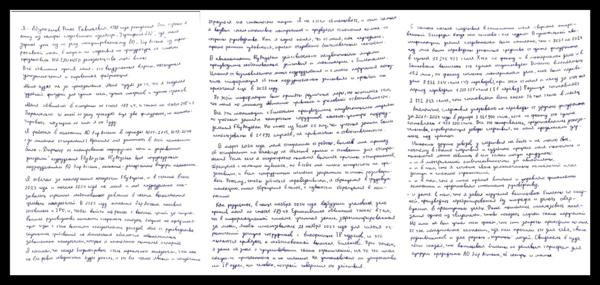 Как стало известно из письма, Абулханов работал в Air Astana в 2011–2015 и 2019–2024 годах, а последней его должностью была позиция директора по планированию маршрутной сети и управлению доходами FlyArystan — структурного подразделения Air Astana. По его словам, в 2023 году, на фоне подготовки компании к IPO, на него и его департамент оказывалось давление с целью демонстрации завышенных и, как он утверждает, нереалистичных коммерческих показателей.