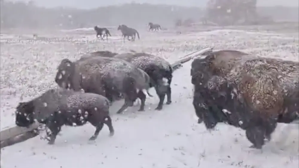В сети появилось видео с бизонами, бегущими по заснеженной равнине. Редкие кадры быстро привлекли внимание пользователей соцсетей, подробнее — на Tengri Travel.