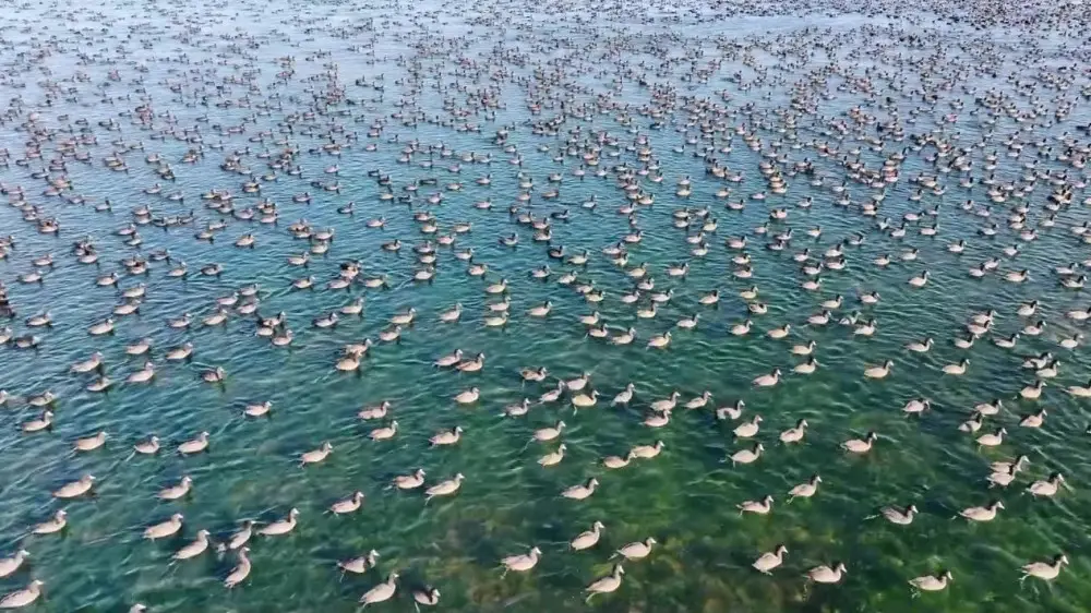 "Кадры были сняты на дрон. Насколько я знаю, температура воды здесь выше, чем на море. Поэтому многие перелетные птицы собираются здесь. Отсюда они дальше летят в теплые края. Только вроде лебеди остаются зимовать в наших местах. Здесь сейчас можно встретить и уток, немного уже есть фламинго", – отметил он.