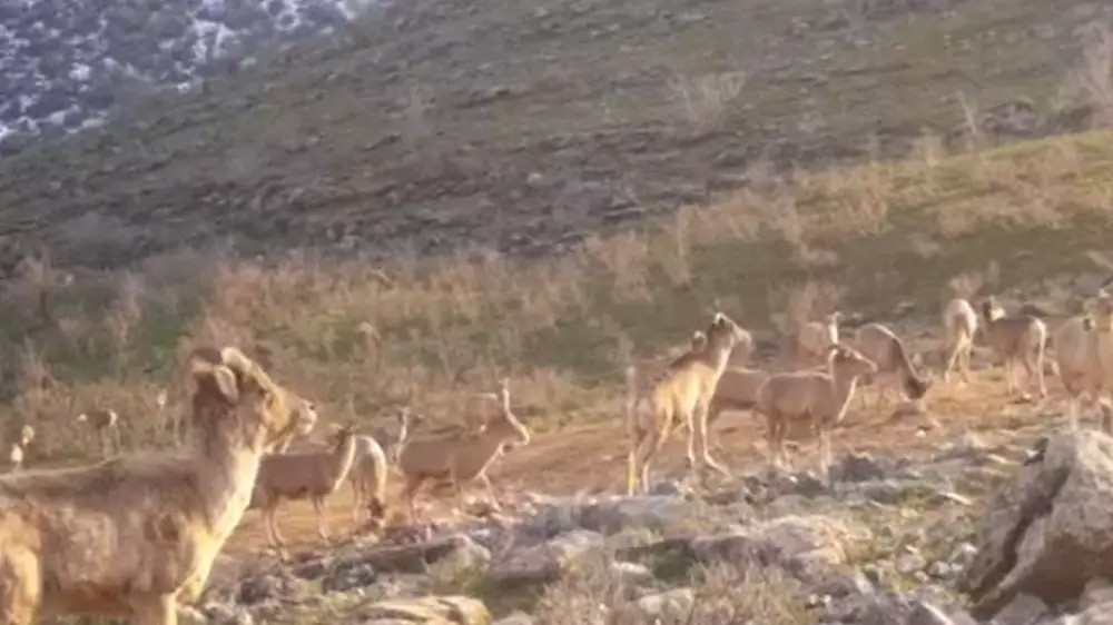 На кадрах видно небольшое стадо из 15 голов, разгуливающих в горах Сайрам-Угамского национального парка.