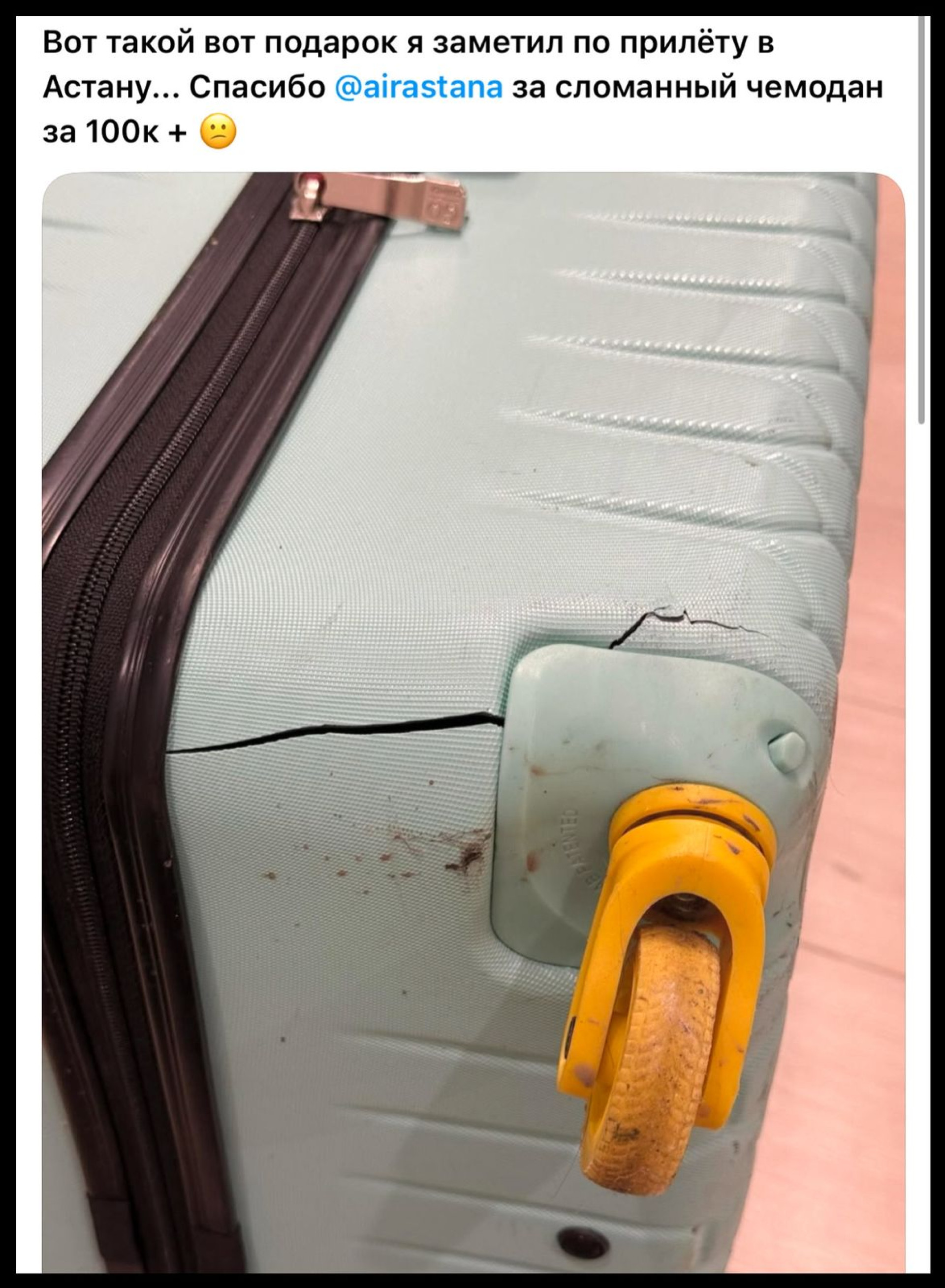 Пассажир по прилёту в Астану обнаружил неприятный сюрприз: его чемодан стоимостью около 100 тысяч тенге получил повреждения. Фото багажа появилось в сети, передаёт Tengri Travel