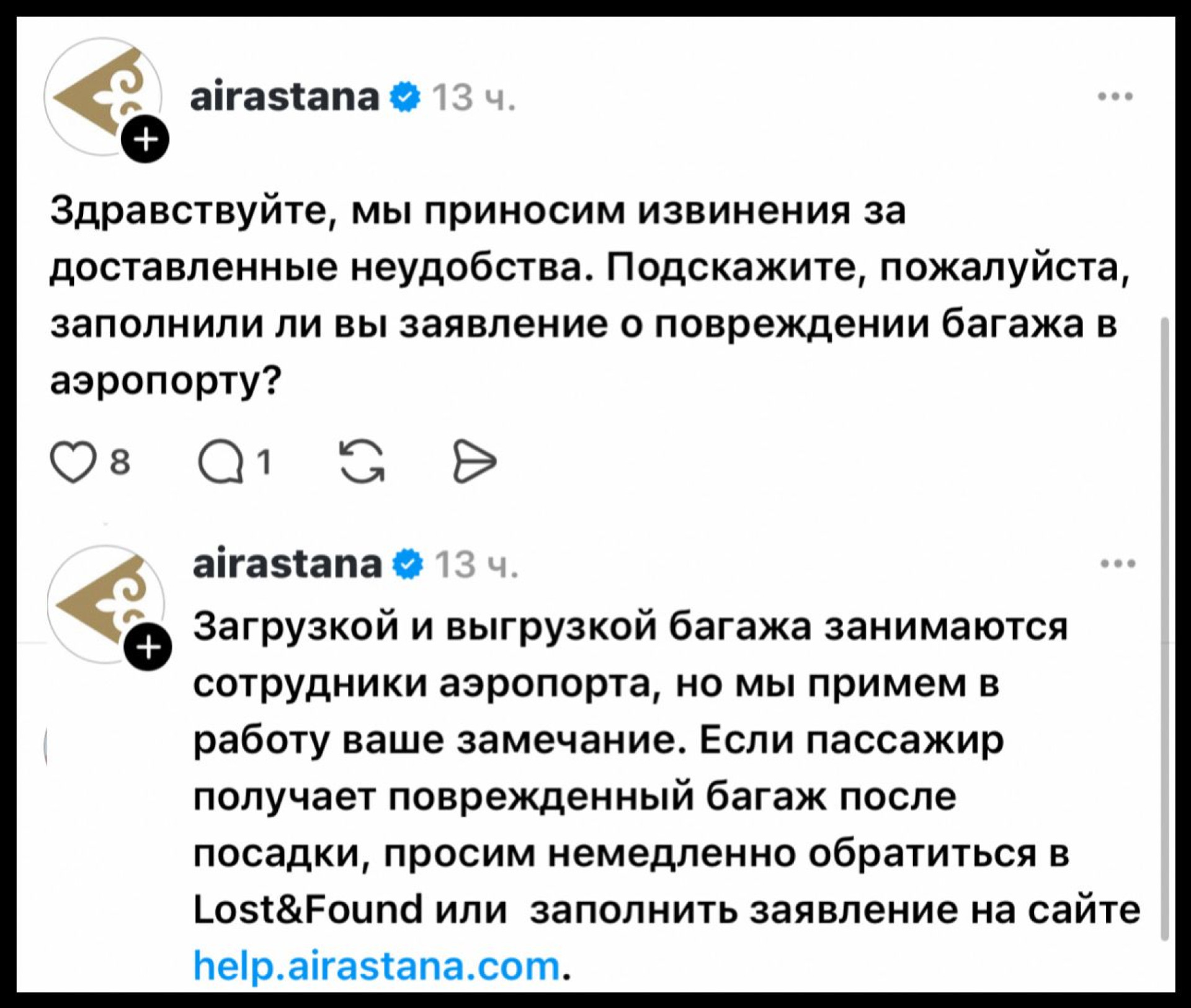 В пресс-службе аэропорта Астаны отметили, что ответственность за сохранность зарегистрированного багажа лежит на авиакомпании