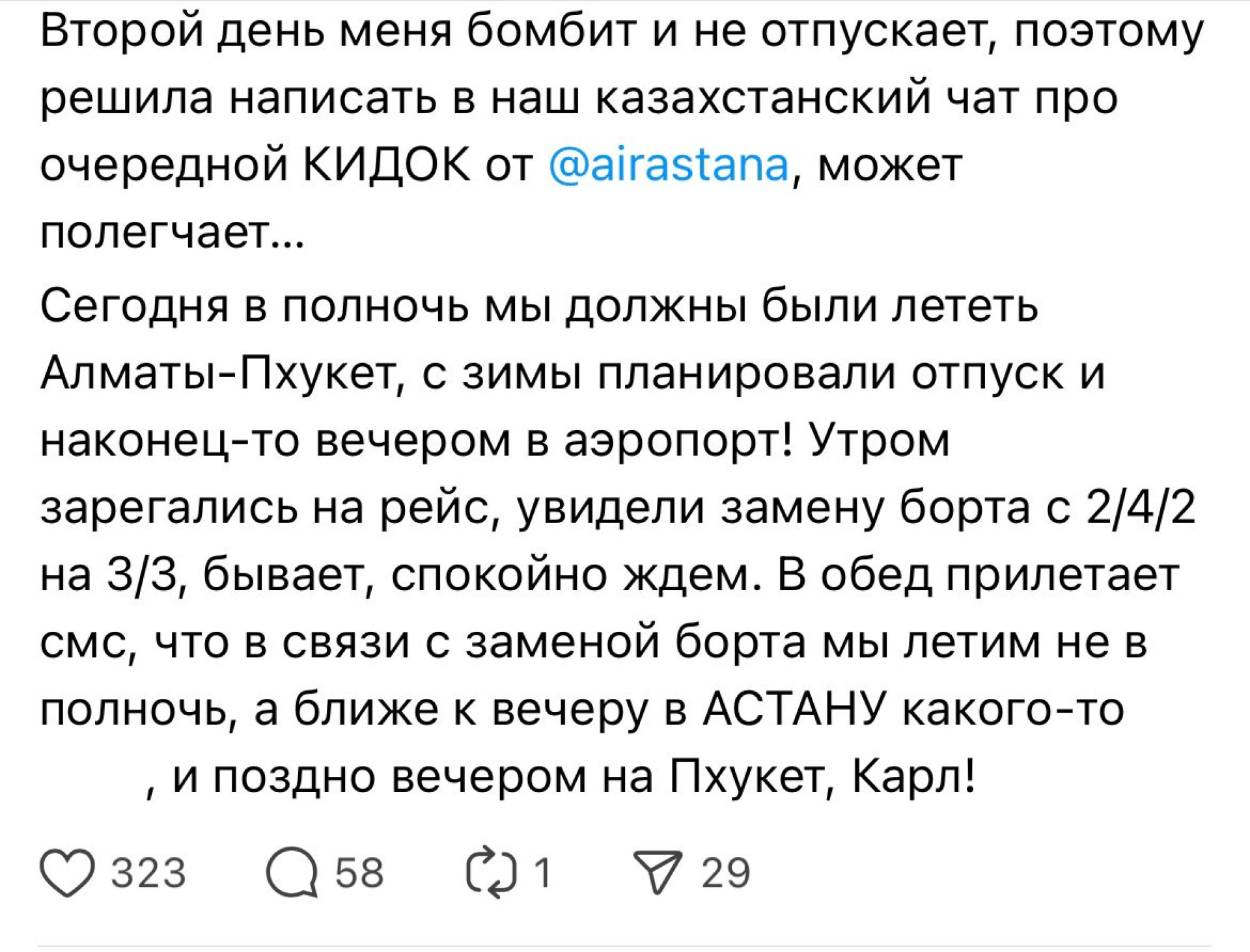 "Сегодня в полночь мы должны были лететь Алматы – Пхукет, с зимы планировали отпуск. Утром зарегистрировались на рейс, увидели замену борта — бывает. В обед приходит SMS, что теперь мы летим не в полночь, а вечером, да еще и через Астану! Мы теряем сутки", — написала она в своем посте.