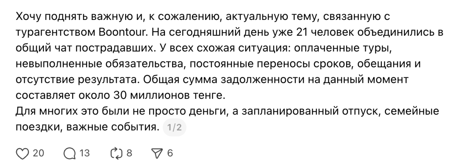 В социальных сетях появились и другие публикации от людей, которые заявляют о похожих проблемах с Boontour. Авторы сообщений утверждают, что оплачивали туры, которые впоследствии отменялись, а возврат средств либо затягивался, либо производился частично. Некоторые пользователи сети отметили, что узнали о других пострадавших только после отмены собственных поездок.