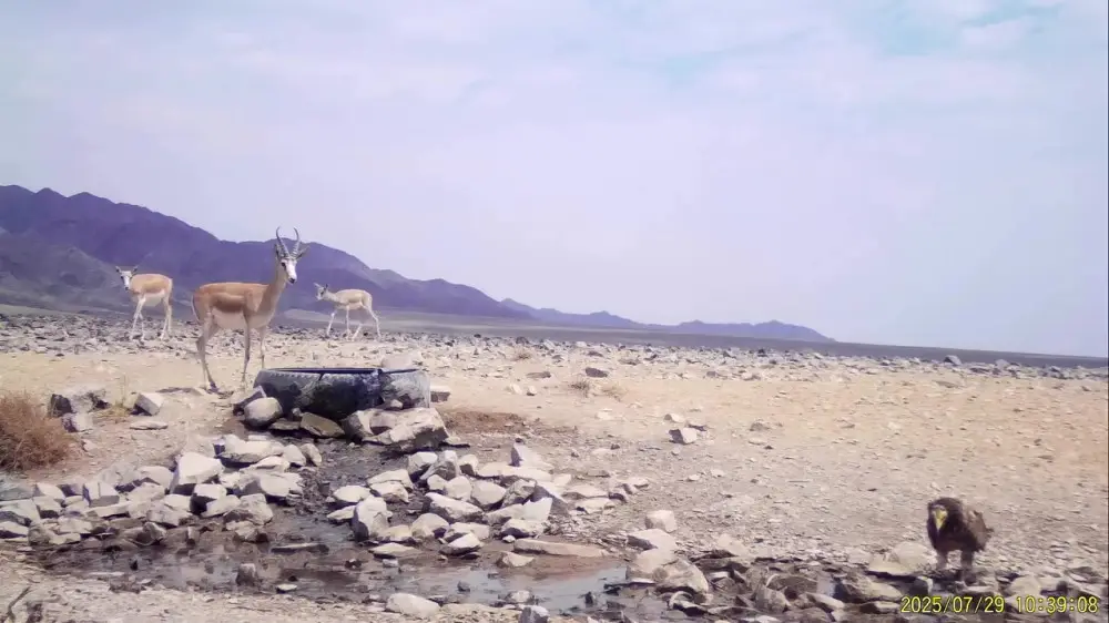 "В Чарынском парке зафиксирован редкий кадр! Фотоловушка одновременно запечатлела два вида, занесённых в Красную книгу Казахстана: джейранов и стервятника. Они подошли к искусственному водопою, чтобы утолить жажду", - сообщили в нацпарке.