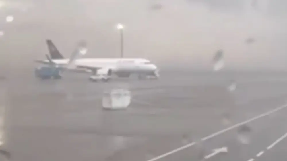 На кадрах видно, как сильный ветер несет контейнер к самолету, а позже он ударяется об него.