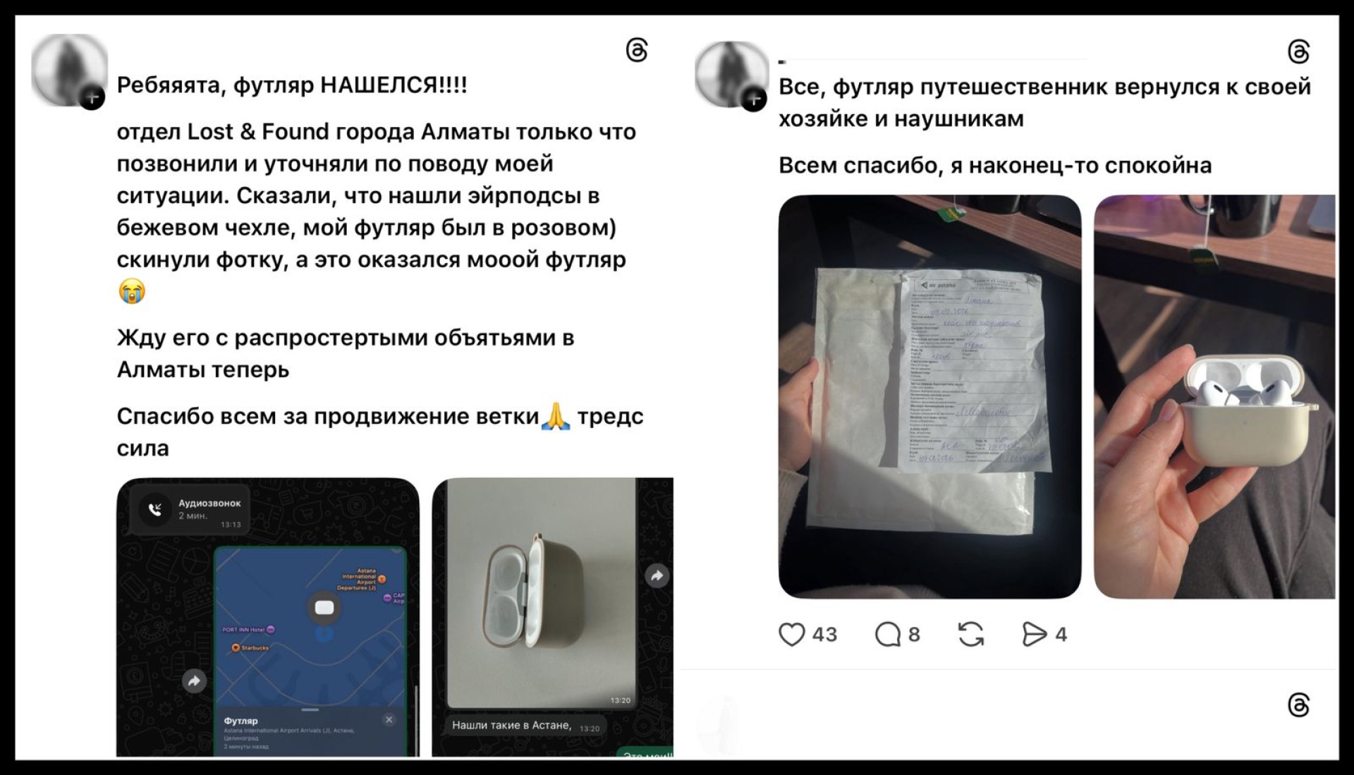 "Позвонили из отдела Lost & Found города Алматы и уточнили детали по моей ситуации. Сказали, что нашли AirPods в бежевом чехле (хотя мой был в розовом). Скинули фото, и это оказался мой футляр!" — рассказала она.