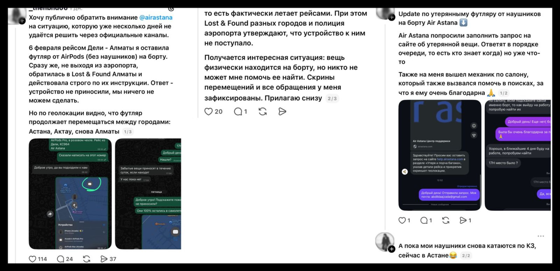 История началась 6 февраля. Айзада, вернувшись из Дели рейсом Air Astana, обнаружила, что оставила на борту кейс от AirPods. Девушка сразу обратилась в службу Lost & Found, но там лишь пожали плечами.