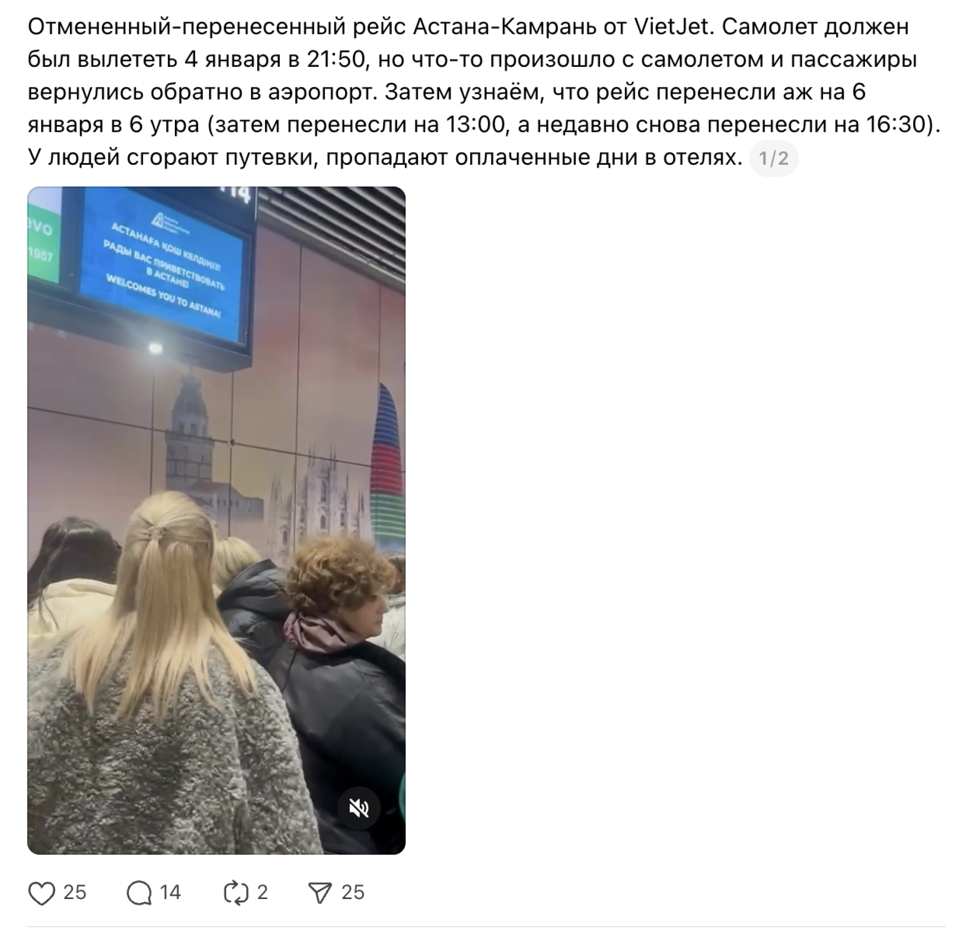 "Рейс перенесли аж на 6 января в 6 утра (затем перенесли на 13:00, а недавно снова перенесли на 16:30). У людей сгорают путевки, пропадают оплаченные дни в отелях", — говорится в посте.